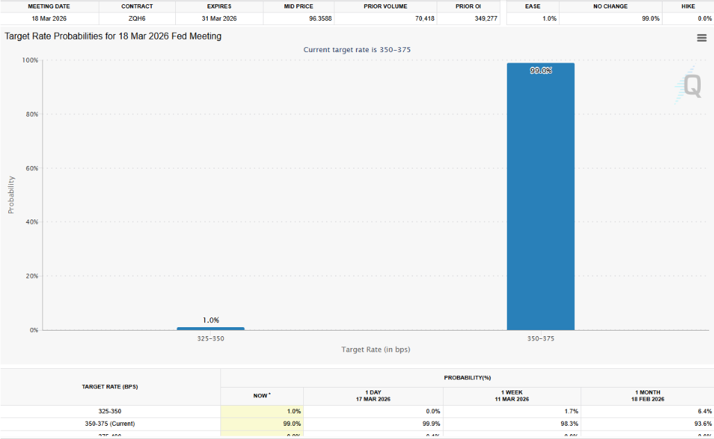 Prima della pubblicazione del PPI, i dati del CME FedWatch mostravano una probabilità del 99% che la Fed decidesse di mantenere i tassi invariati al 3,50%-3,75%. Il dato shock di oggi non fa che rafforzare questa aspettativa, riducendo al contempo le finestre per un possibile allentamento monetario più avanti nel 2026. La narrazione di un taglio dei tassi, data per certa solo poche settimane fa, ora vacilla pericolosamente.